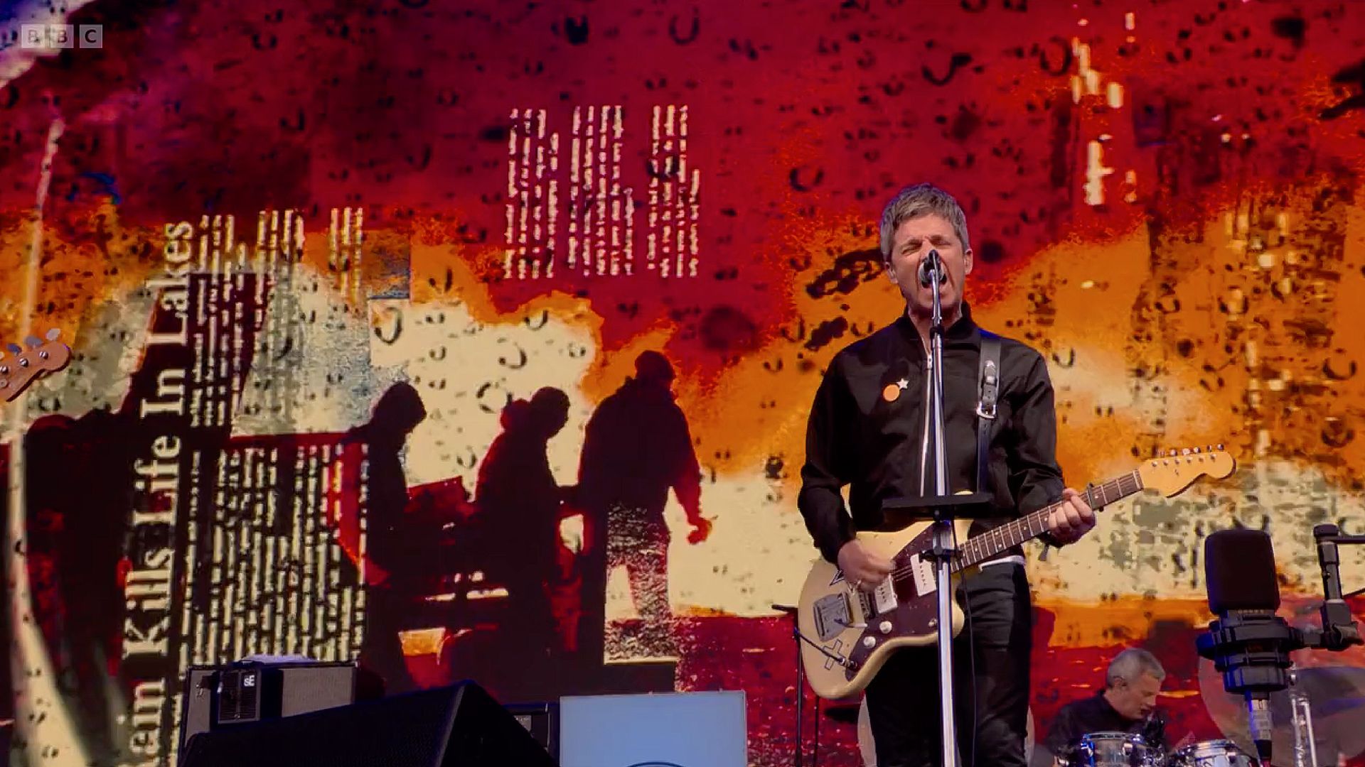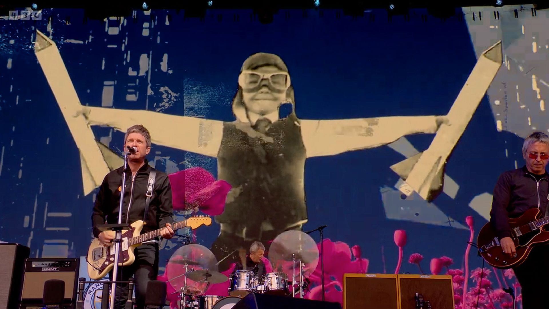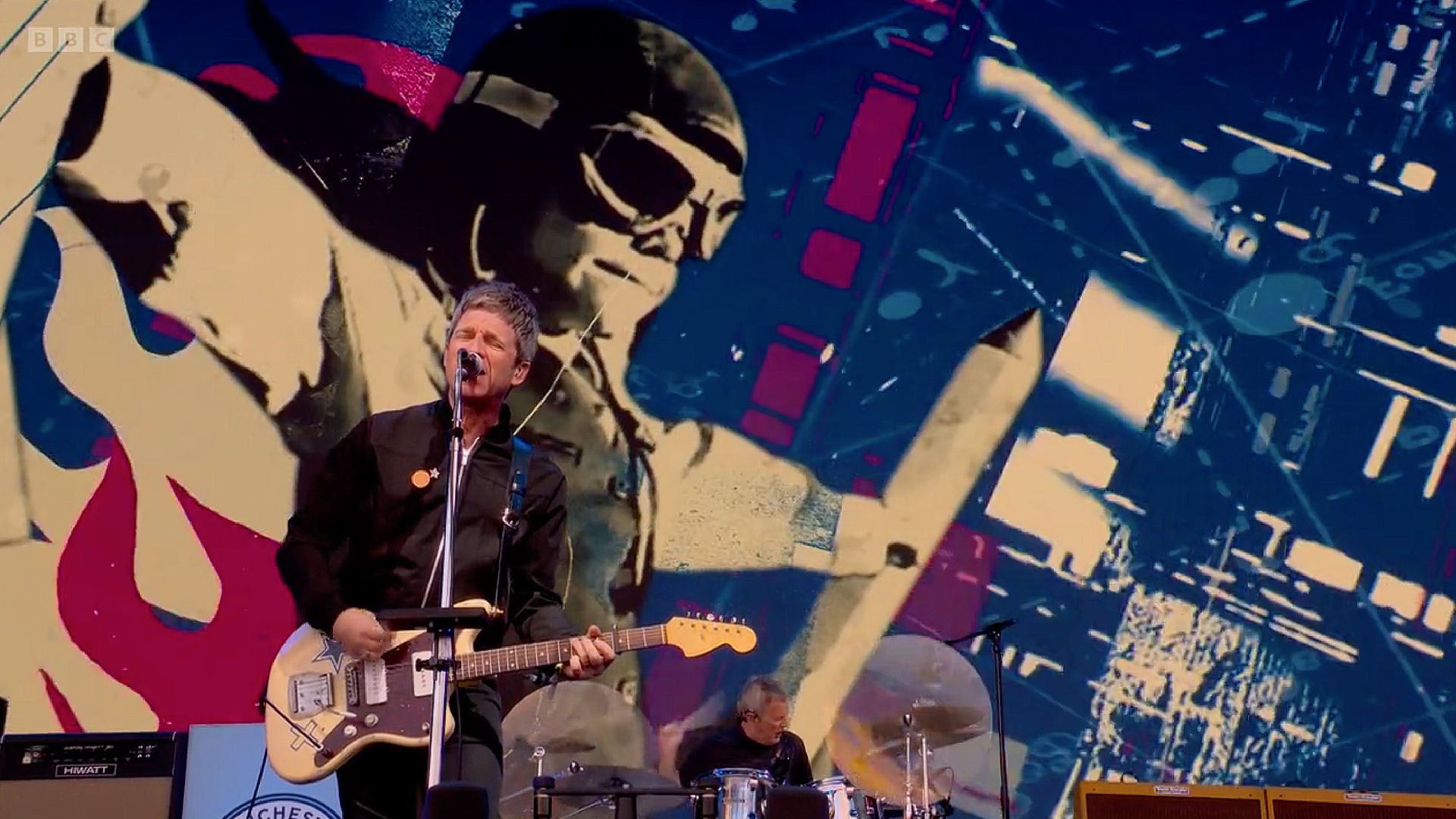 Video screen for Noel Gallagher's High Flying Birds Glastonbury 50th anniversary set on the main pyramid stage. Using a heavy mix of rotoscoped footage, crushed and punked up with analogue mark-marking against ultra punchy neon colours. Projected on Glastonbury's epic 18m x 10m screen. 1 of 8 videos.
